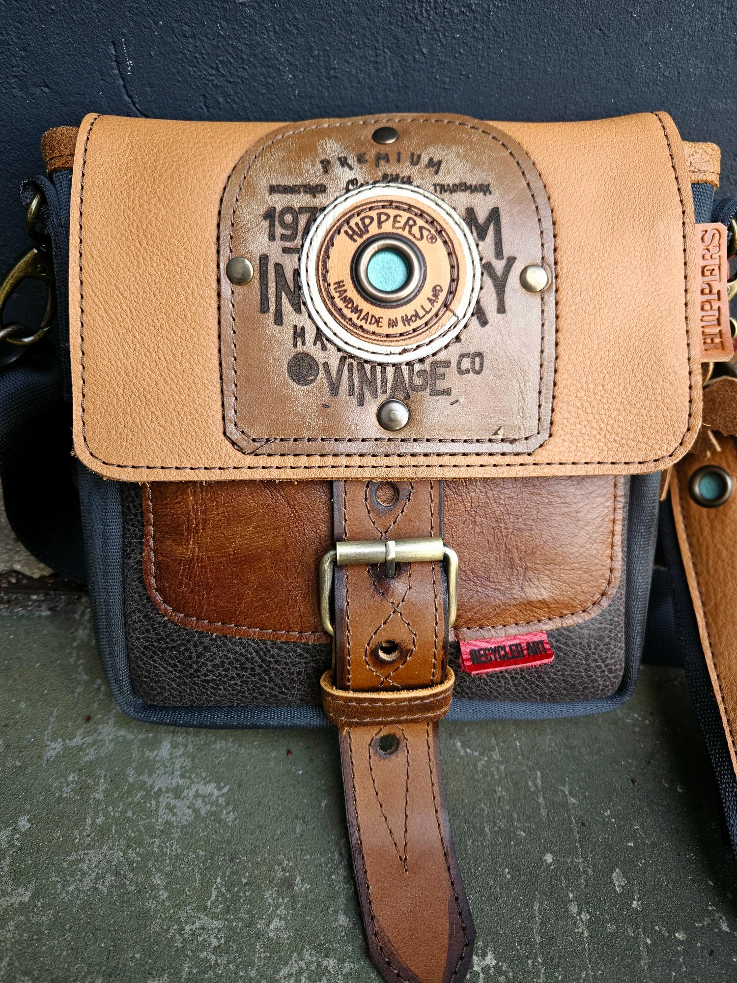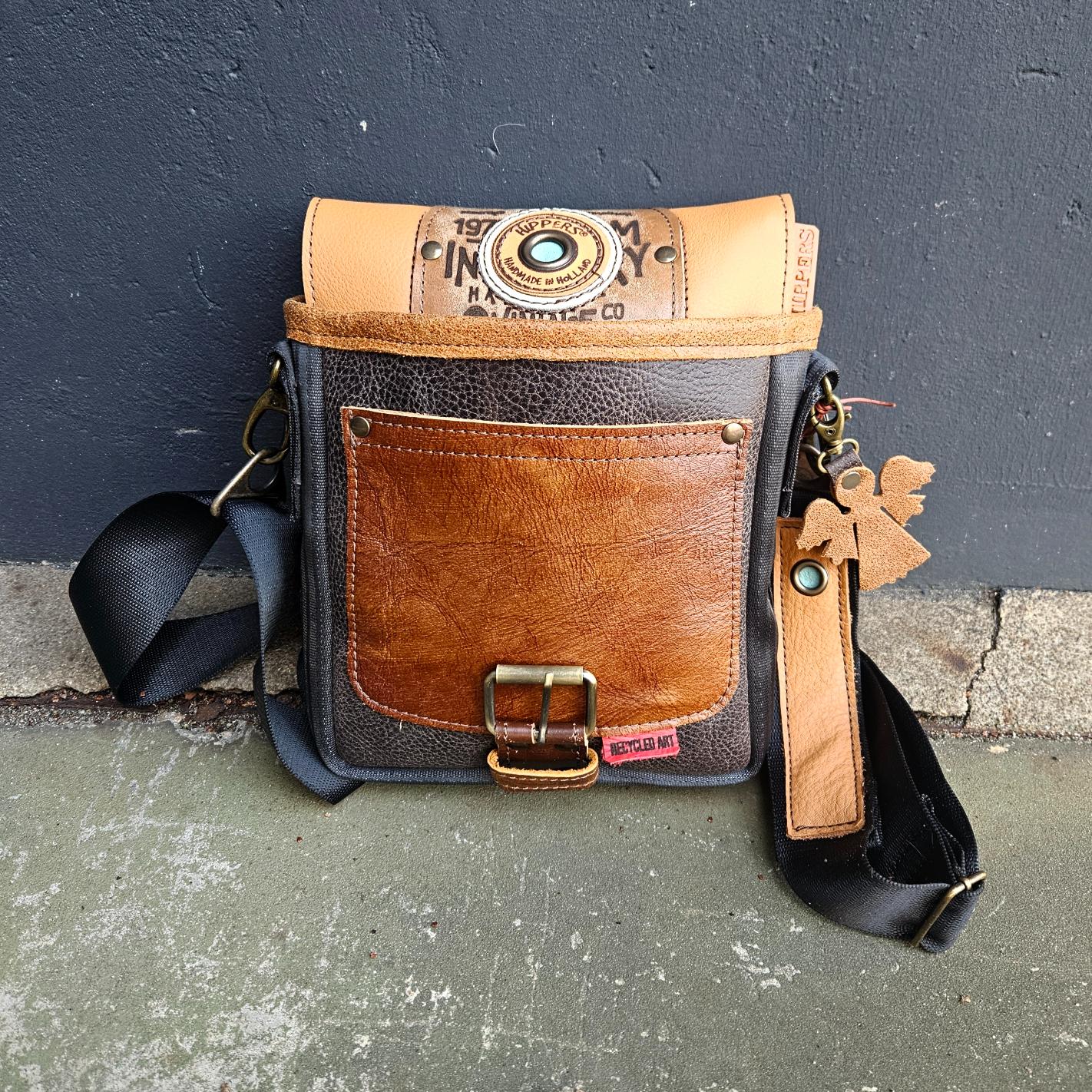 Gemaakt van gerecycled leer en gerecyclede autogordels. Stoer en uniek!!!!!