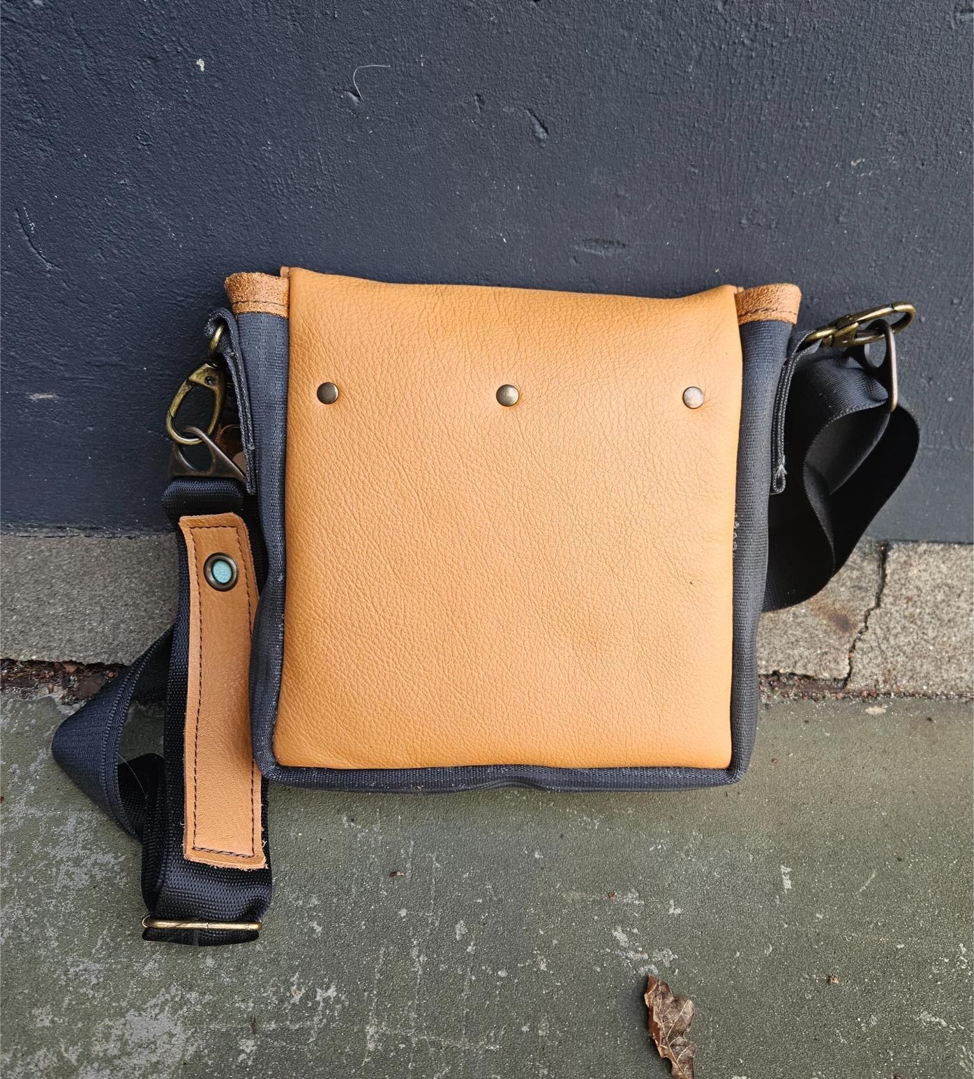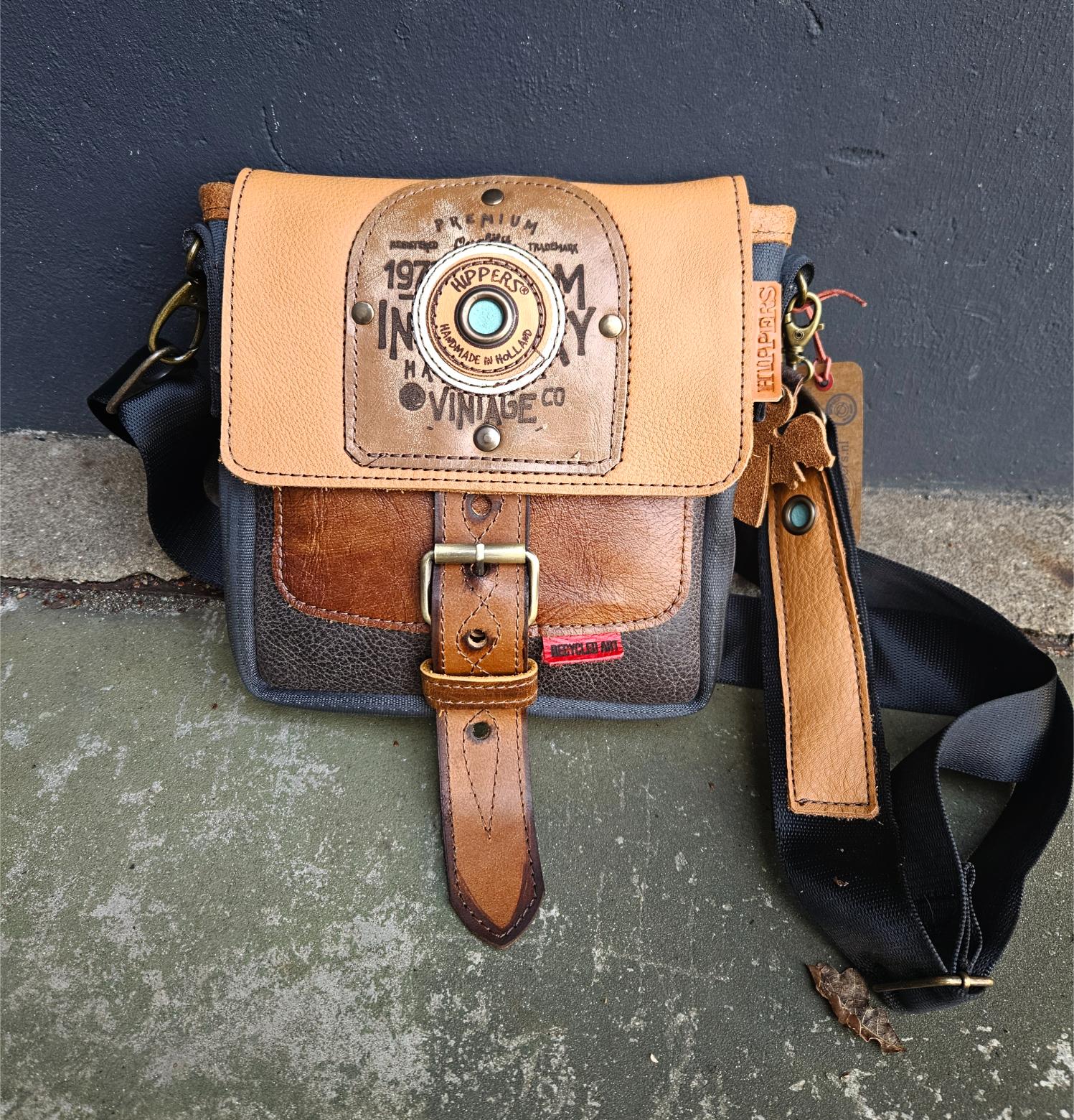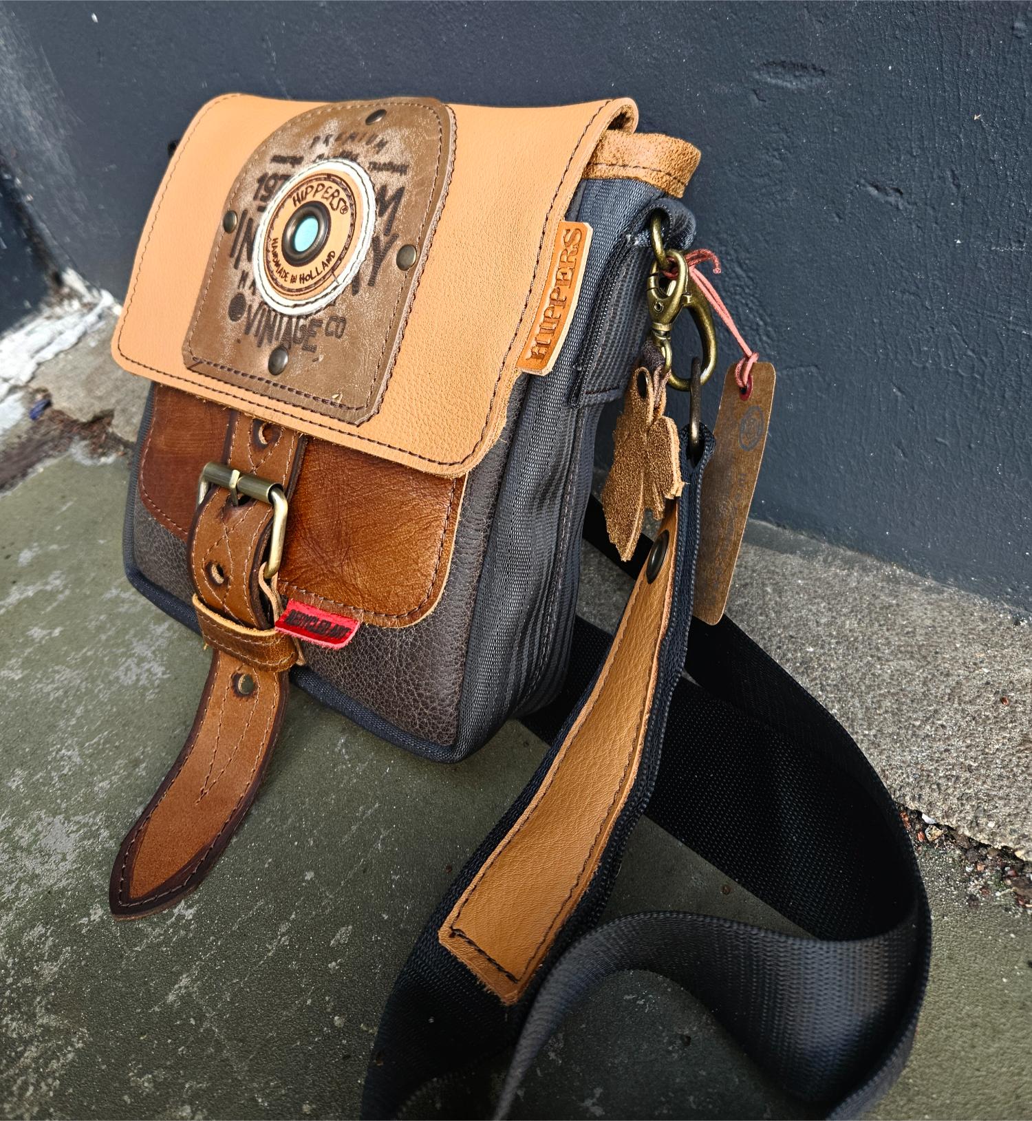 De kleinere en eenvoudigere variant van de Gordeltas L en XL. Binnen voorzien van zijvakje. De tas is dus ook gemaakt van autogordel en daarnaast van gerecycleerd leer afkomstig van oude meubels en restmateriaal