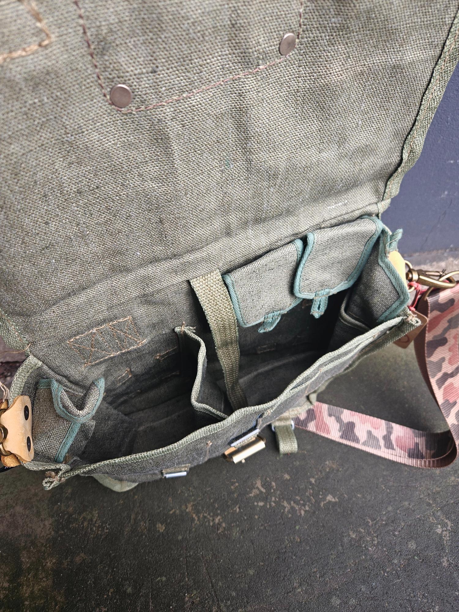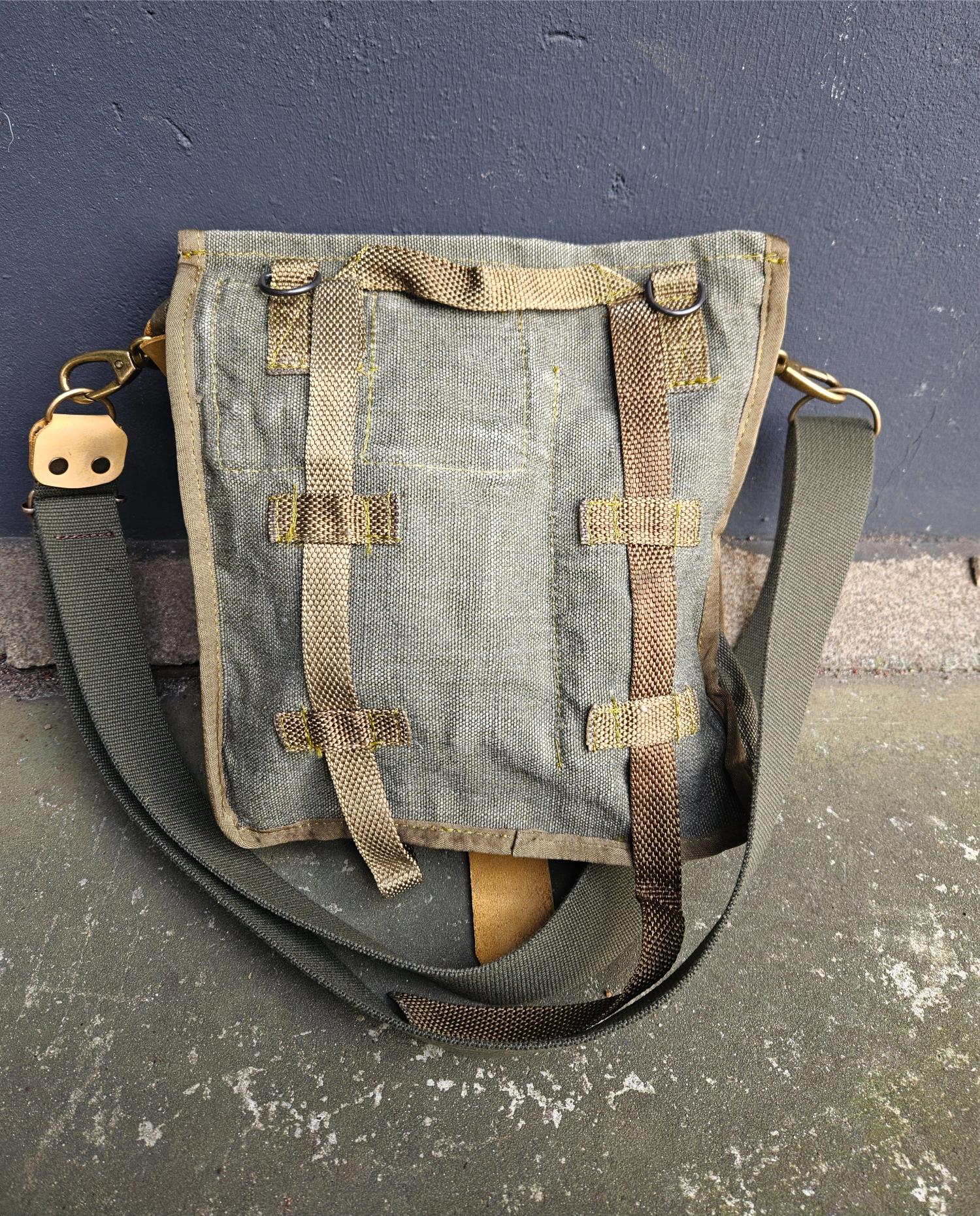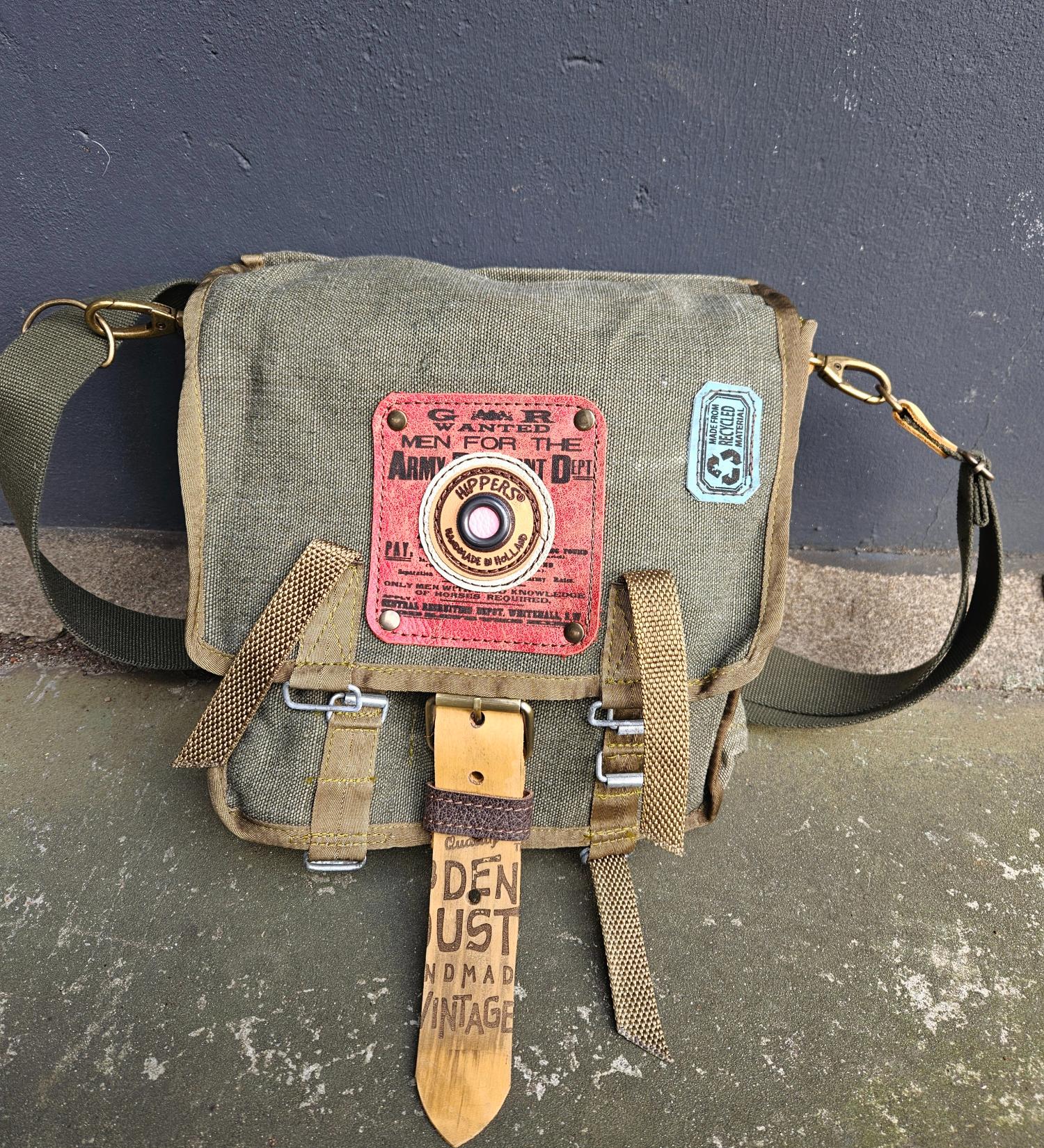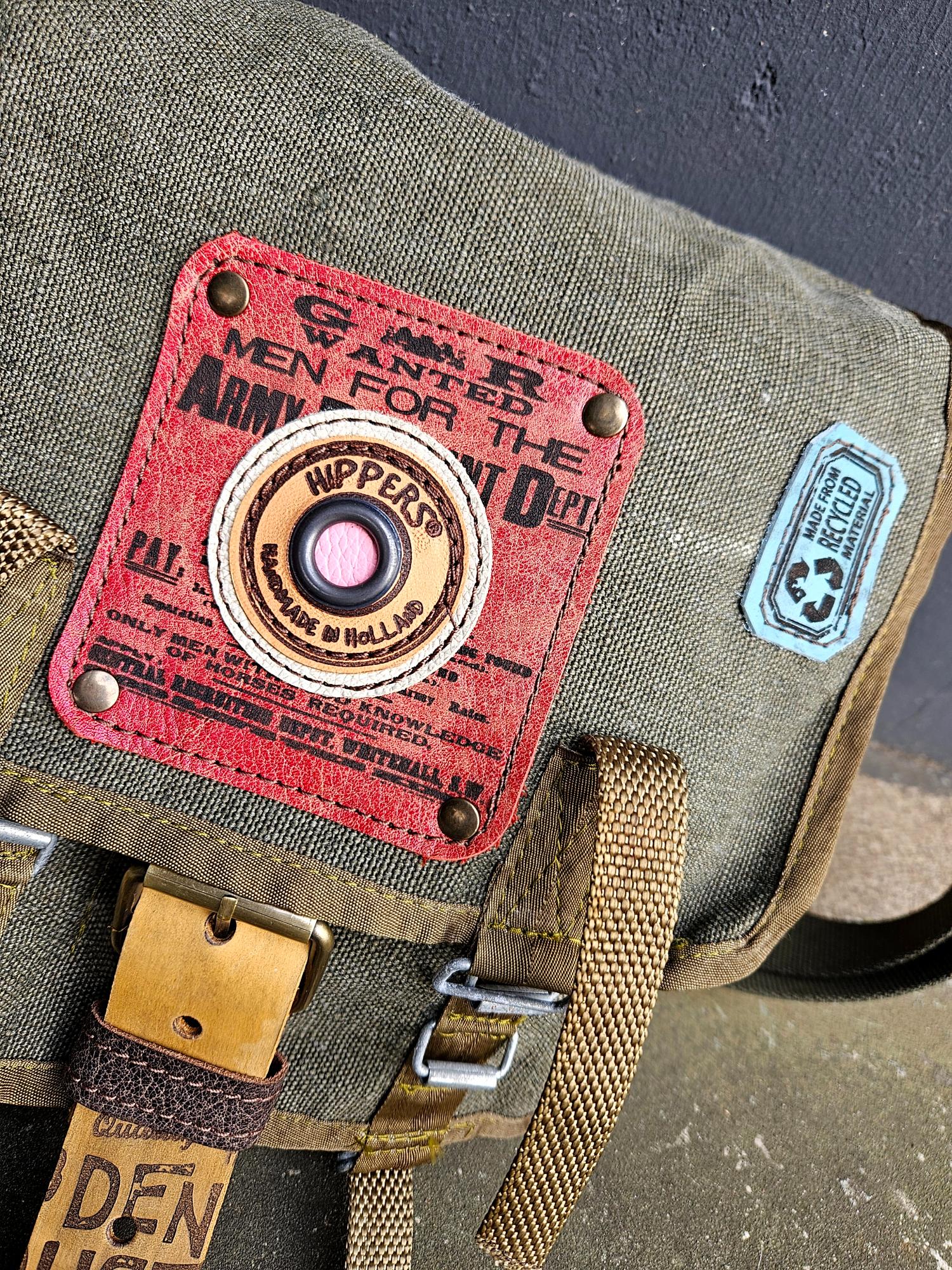 Deze bijzondere pukkeltas begon zijn leven als een stevige, oude Poolse legercanvas tas en kreeg dankzij Hippers een tweede, stijlvolle kans. De originele militaire uitstraling is behouden, maar opgepimpt met prachtige accenten van leer afkomstig van oude bankstellen. Zo krijgt elk stuk materiaal een nieuw leven en ontstaat een tas met een verhaal.