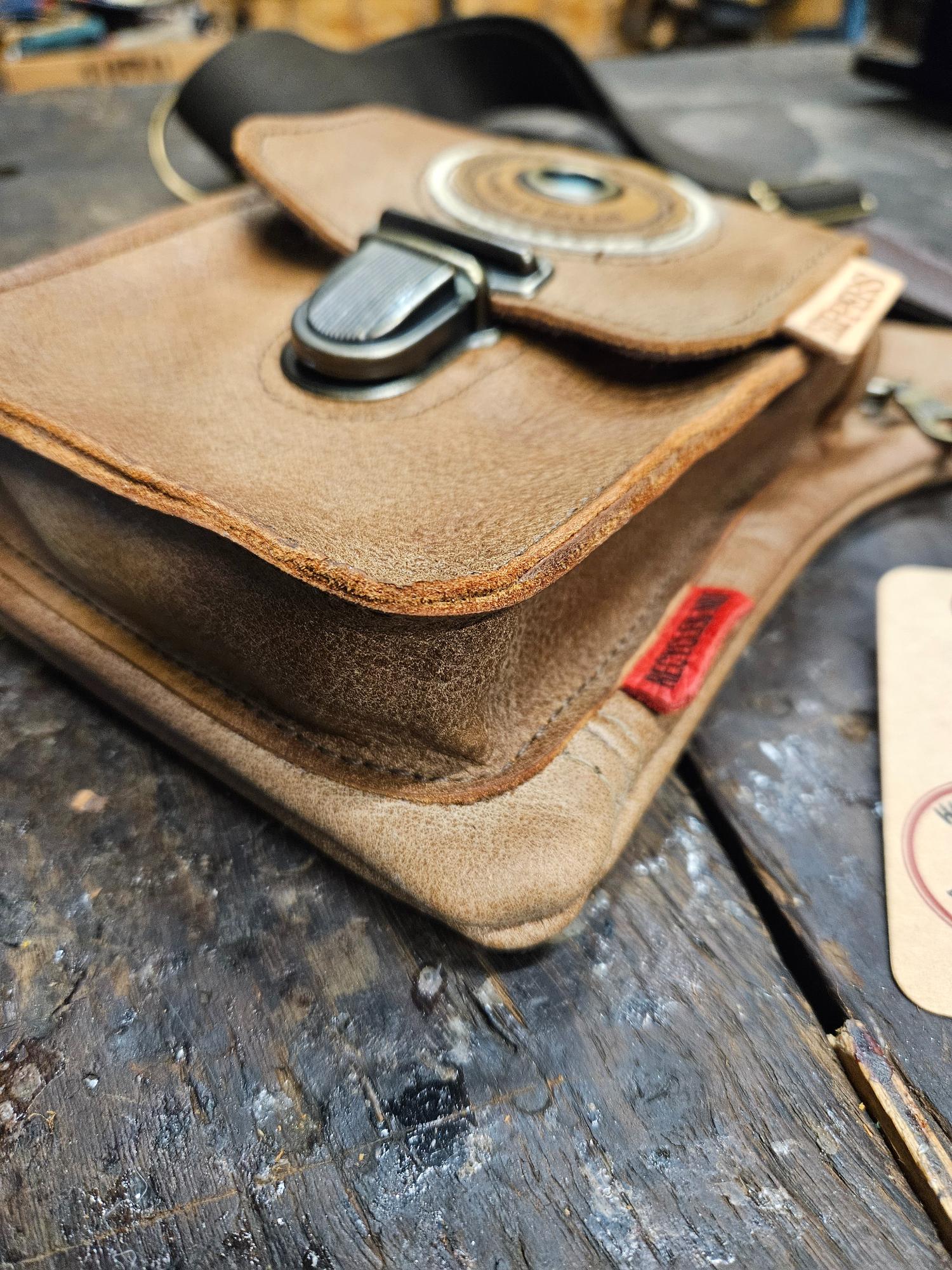 Het leer is afkomstig van oude lederen banken/stoelen. Echt een uniek recycleproject dus! Bij grotere mensen handig om er dan een verlengbandje bij te bestellen als je deze cross-over wil dragen.