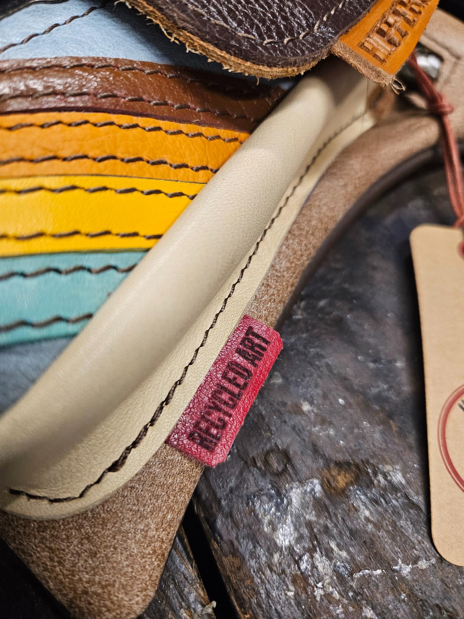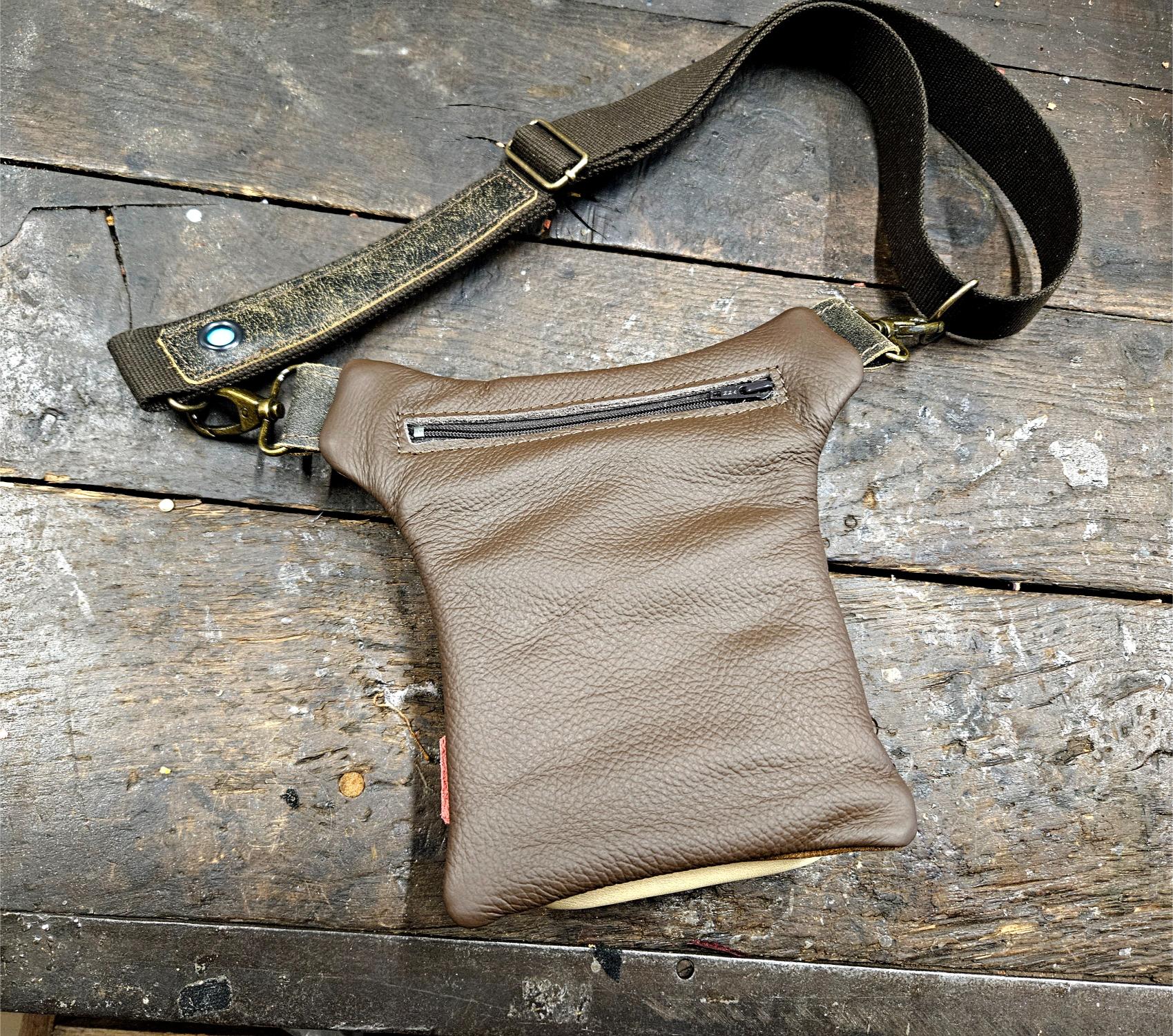 Het leer is afkomstig van oude lederen banken/stoelen. Echt een uniek recycleproject dus! Bij grotere mensen handig om er dan een verlengbandje bij te bestellen als je deze cross-over wil dragen.